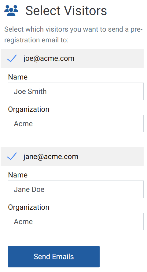 Select which visitors you want to send pre-registration emails to. Be sure to define names and organizations for each visitor.